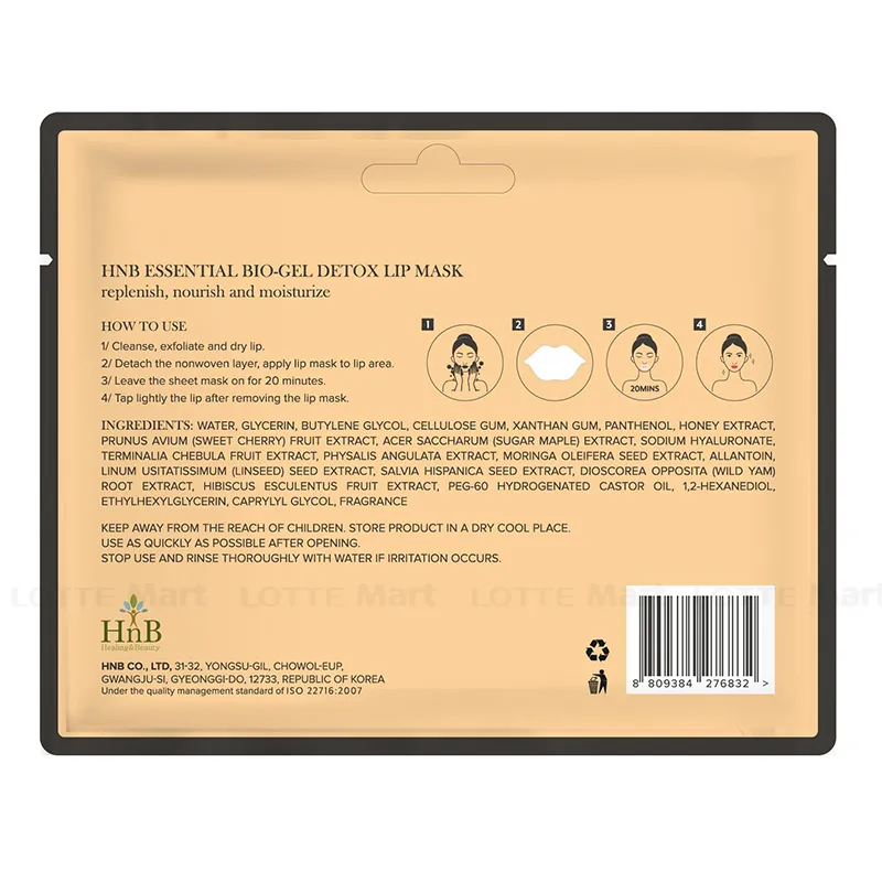 - Mặt Nạ Môi HNB Bio-Gel Detox chiết xuất mật ong và quả anh đào giúp cấp ẩm, dưỡng ẩm cho môi căng mọng và làm đầy vân môi và làm môi mềm mịn.