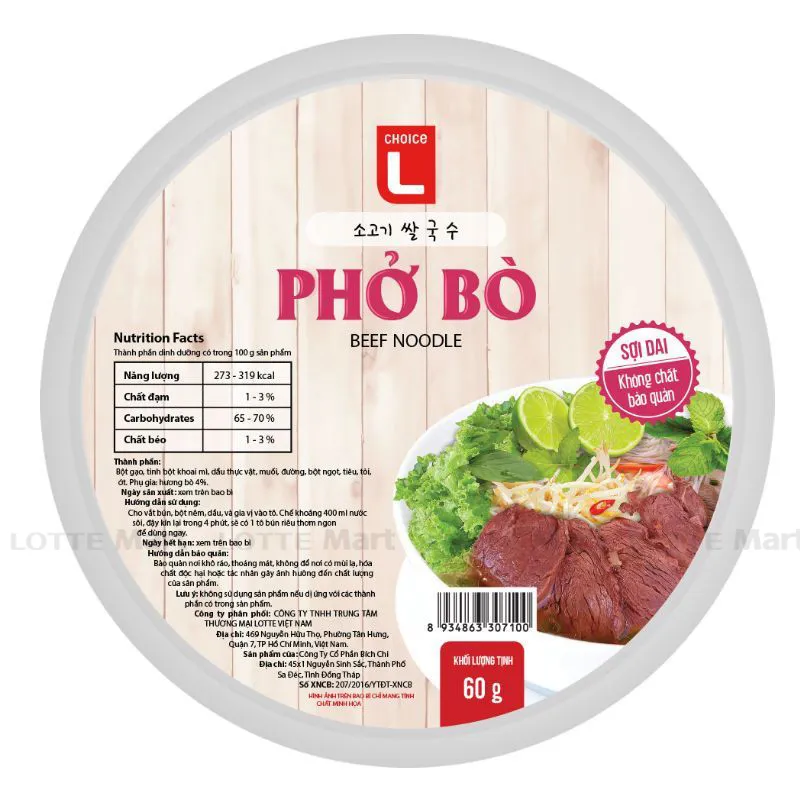 Phở Bò Choice L (CL)Tô 60G gây ấn tượng hương vị phở bò truyền thống đậm đà của Việt Nam, không cần ra hàng quán bạn vẫn có thể thưởng thức phở bò đóng gói từ thương hiệu Choice L. Sản phẩm được sản xuất trên dây chuyền công nghệ khép kín, đảm bảo vệ sinh an toàn thực phẩm cho người tiêu dùng. Có thể dùng làm bữa ăn nhanh đầy bổ dưỡng.
