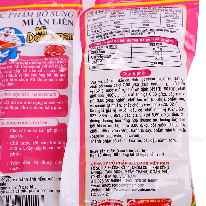 Mì Acecook Doremon Tôm Gà Tỏi Phi là sản phẩm chất lượng cao của thương hiệu Acecook. Đây là sản phẩm rất được các bạn nhỏ (từ 6 tuổi trở lên) ưa chuộng vì có thể ăn sống hoặc chín đều rất ngon. Không những vậy, trong mỗi gói mì còn có hình dán Doraemon ngộ nghĩnh tạo cảm giác thích thú cho các bạn nhỏ. Thành phần: Bột mì, Shortening, Tinh bột khoai mì, Muối, Gia vị…Hướng dẫn sử dụng: Cho 320ml nước sôi vào mì và các gói gia vị. Đậy nắp kín trong khoảng 3 phút. Hoặc trộn gia vị vào mì để ăn sống. Hướng dẫn bảo quản: Bảo quản nơi khô thoáng, mát mẻ.