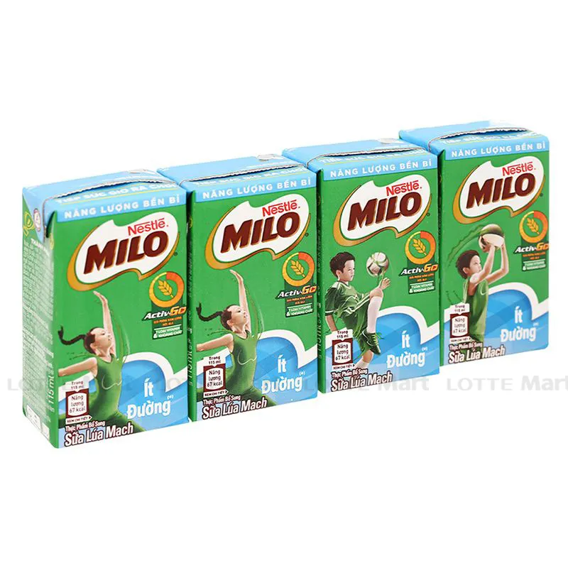 - Sữa lúa mạch Milo thơm ngon từ lúa mạch, cung cấp đạm và canxi cho cơ thể. Milo từ lâu luôn là thương hiệu sữa uống lúa mạch được các bé yêu thích. Lốc 4 hộp sữa lúa mạch cacao ít đường cung cấp 7 loại vitamin và khoáng chất cho bé giải phóng năng lượng hiệu quả.