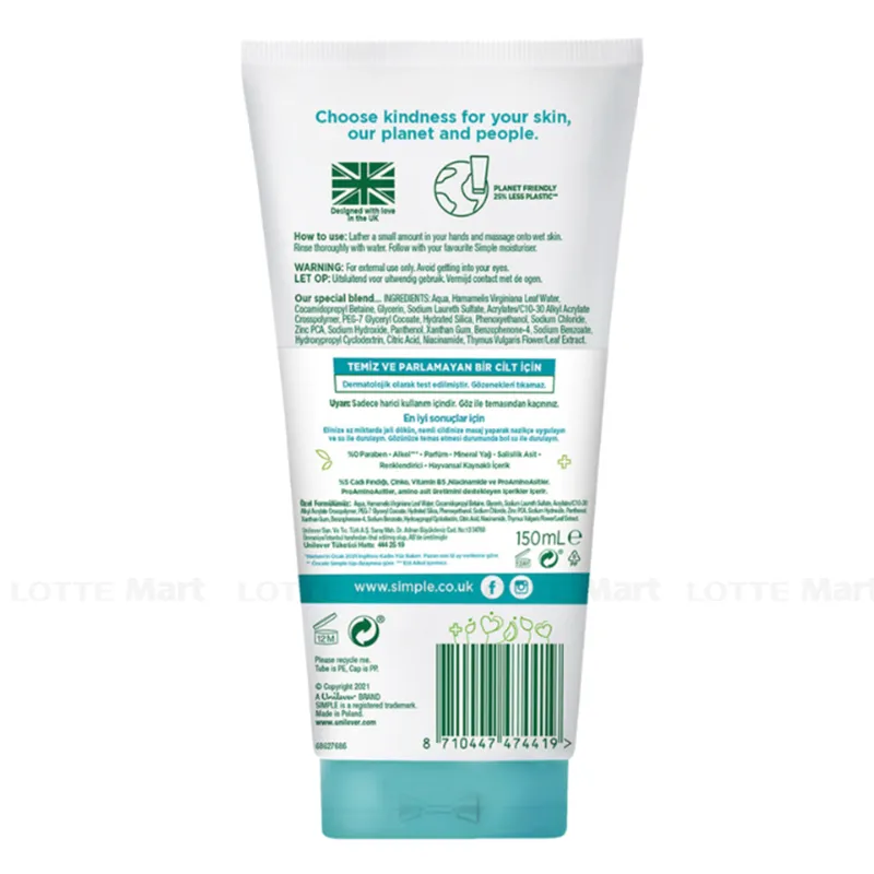 Sữa Rửa Mặt Simple Kiềm Dầu Ngừa Mụn Cho Da Mụn được chiết xuất từ cây phỉ, cỏ xạ hương, kẽm, prebiotic từ thực vật, vitamin B3 giúp làm sạch bụi bẩn, dầu thừa, bã nhờn đồng thời ngăn ngừa mụn hiệu quả. Sản phẩm không chứa 2000 hoạt chất có hại cho làn da, lành tính và không gây kích ứng cho da.