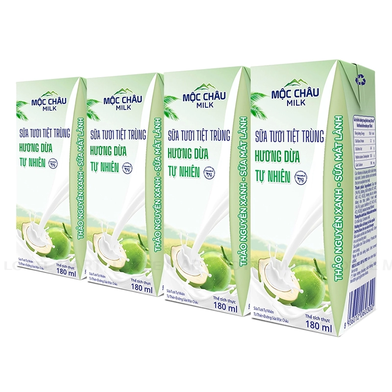 • Sữa Tươi Tiệt Trùng Mộc Châu Hương Dừa Lốc 4 Hộp 180ml được chế biến từ nguồn sữa tươi thuần khiết trên thảo nguyên Mộc Châu kết hợp với công nghệ từ Châu Âu, tạo ra những sản phẩm sữa tươi trọn vẹn tự nhiên, giàu dinh dưỡng, ngọt lành tươi mát, tốt cho sức khỏe mọi người.
