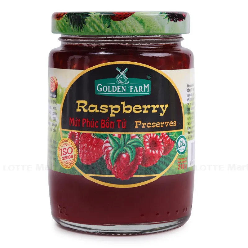 Mứt Phúc Bồn Tử Golden Farm 210g - với thành phầnphúc bồn tử trái thơm tươi được chọn lọc kỹ càng cùng hương liệu tự nhiên sẽ mang đến cho bạn món mứt ngọt và chua vừa phải, kích thích cảm giác ăn uống.