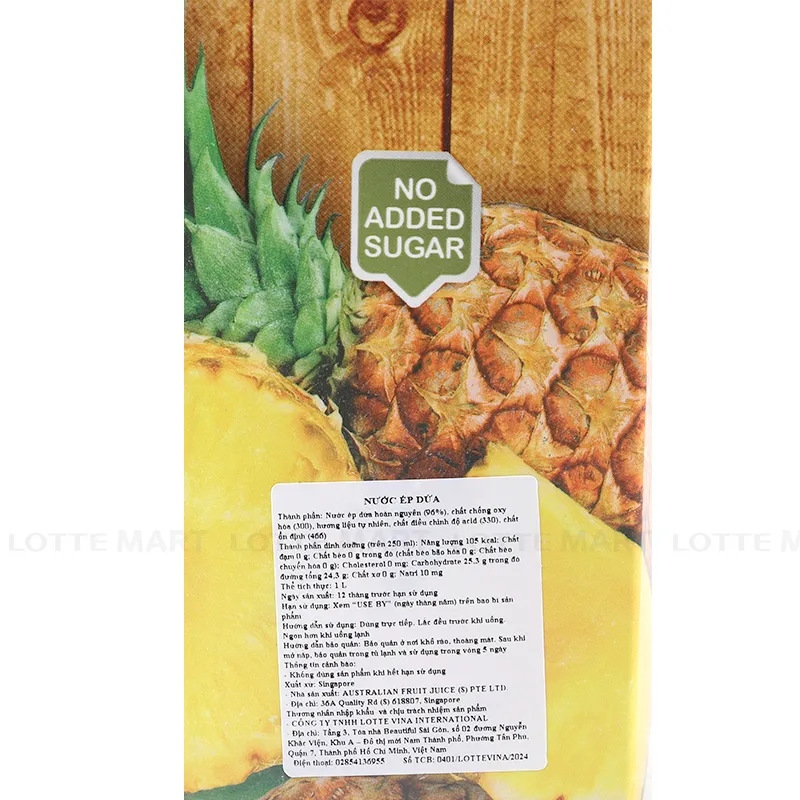 - Nước ép dứa hoàn nguyên (96%), chất chống oxy hóa (300), hương liệu tự nhiên, chất điều chỉnh độ acid (330), chất ổn định (466).