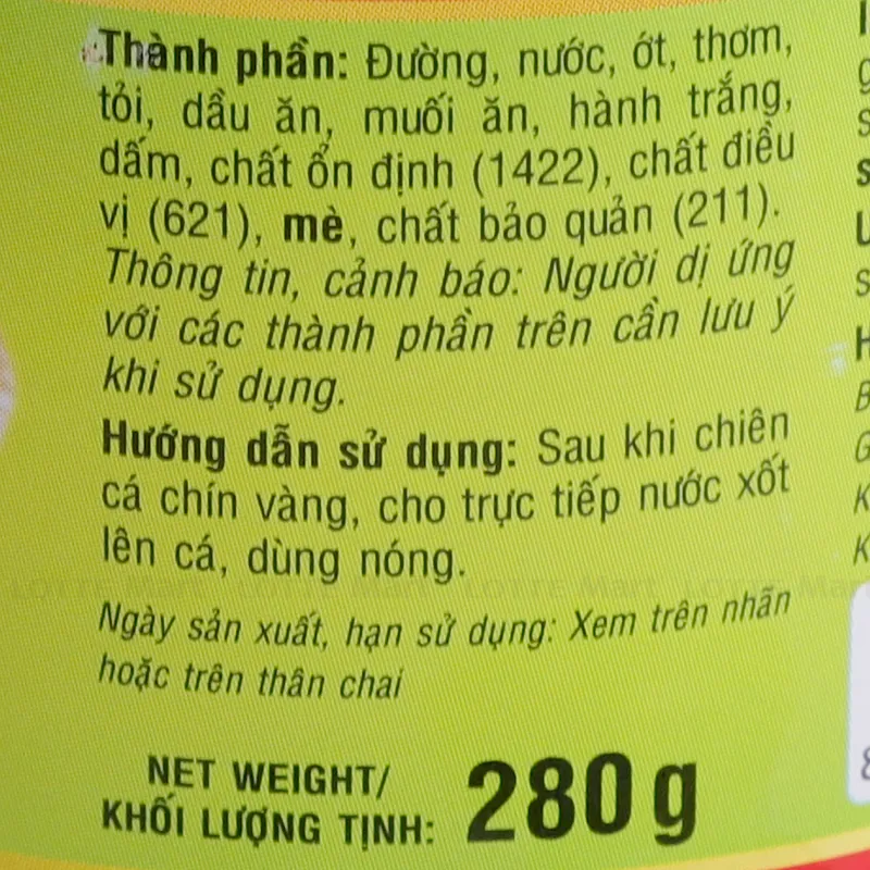 Sốt Cá Chiên Cholimex Chai 280G được làm từ các nguyên liệu an toàn, không chất bảo quản độc hại, mang đến sự an tâm cho người tiêu dùng. Sản phẩm là sự kết hợp độc đáo giữa công thức truyền thống và quy trình chế biến hiện đại đem lại chất lượng nổi bật. Sản phẩm mang tới sự thơm ngon của những nguyên liệu tự nhiên, hương vị đậm đà, kích thích vị giác, phù hợp khẩu vị của người Việt Nam. Thành phần: Ớt, tỏi, thơm, củ hành, đường, muối ăn, dầu ăn, dấm, chất điều vị…Hướng dẫn sử dụng: Sau khi chiên cá chín vàng, cho trực tiếp sốt lên cá, dùng nóng. Hướng dẫn bảo quản: Bảo quản nơi khô ráo thoáng mát, tránh ánh nắng trực tiếp. Giữ lạnh sau khi mở nắp.