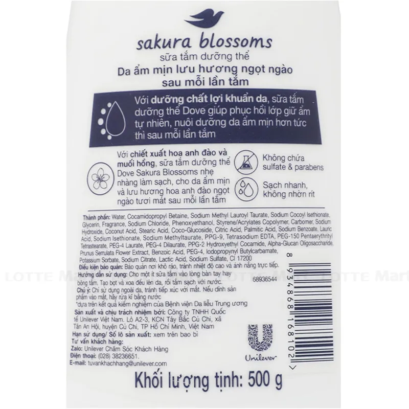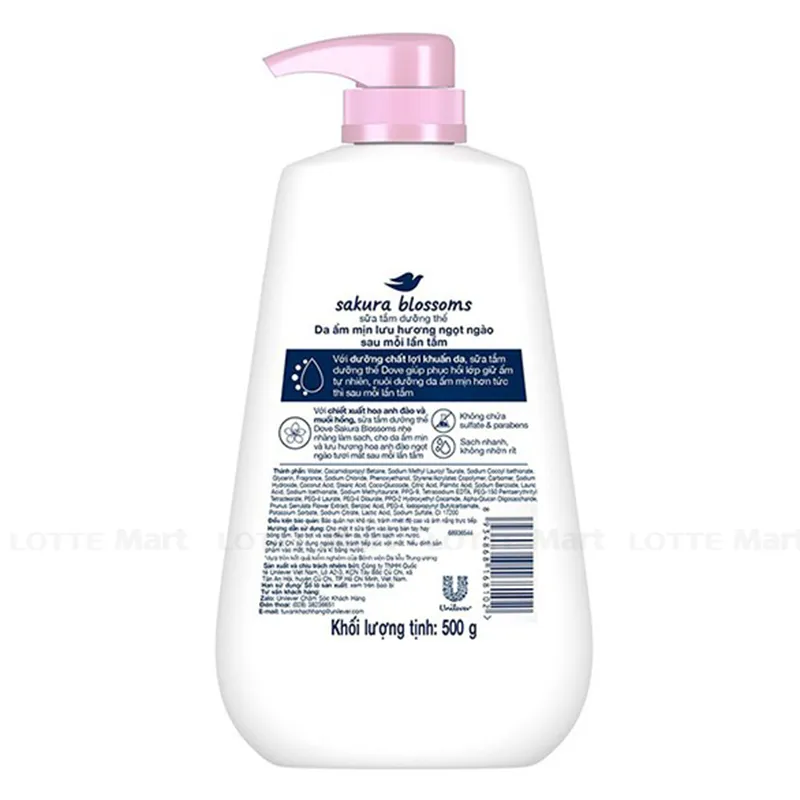 Sữa Tắm Dưỡng Thể Dove Hương Hoa Anh Đào 500g với chiết xuất hoa anh đào và muối hồng cùng công thức sạch nhanh, không nhờn rít với lớp bọt dày mịn nhẹ nhàng làm sạch, cho da mềm mịn và lưu hương hoa anh đào ngọt ngào tươi mát sau mỗi lần tắm.