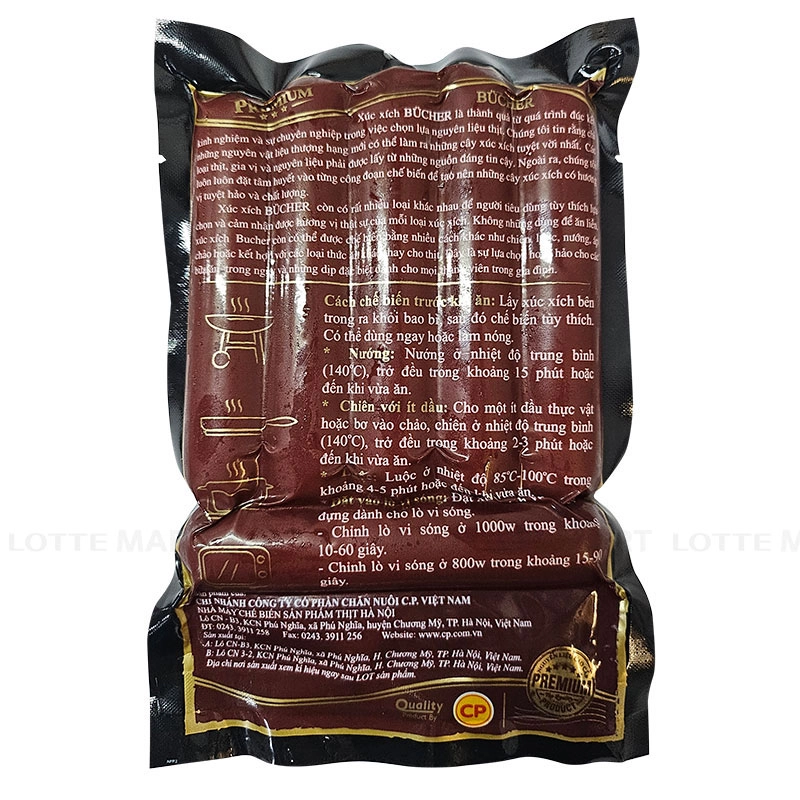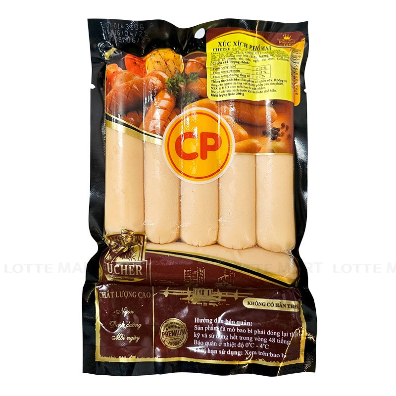Xúc Xích Phô Mai CP Gói 200g với nguồn nguyên liệu này được chọn lọc kĩ càng, chế biến trên dây chuyền hiện đại. Xúc xích phô mai viên CP gói 200g là sản phẩm xúc xích nhân phô mai béo ngậy, giúp bạn tiết kiệm tối đa thời gian nấu nướng mà vẫn có món ăn nhanh thơm ngon cho bữa ăn của mọi gia đình. Thành phần: Thịt gà, mỡ heo, phô mai (hơn 10%), tinh bột mì biến tính, đường, muối, đạm đậu nành, sữa bột gầy, chiết xuất ớt, chất bảo quản, chất mang, chất điều vị, chất nhũ hoá, chất điều chỉnh độ acid, chất chống oxy hoá, hương thực phẩm tổng hợp (hương ngò, tiêu, hành, gà, tỏi) Cách dùng: Chế biến bằng lò vi ba, hấp hoặc chiên, làm các món ăn tuỳ thích. Bảo quản: Bảo quản lạnh ở nhiệt độ 0 - 4 độ C.