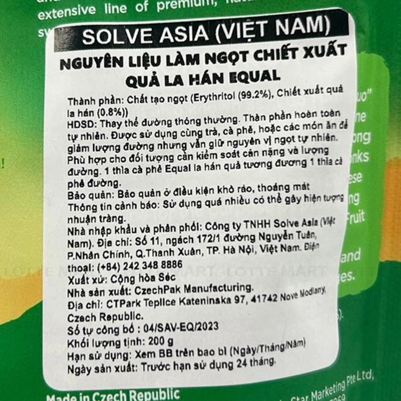 - Chất tạo ngọt (Erythritl (99.2%), chiết xuất quả la hán (0.8%).