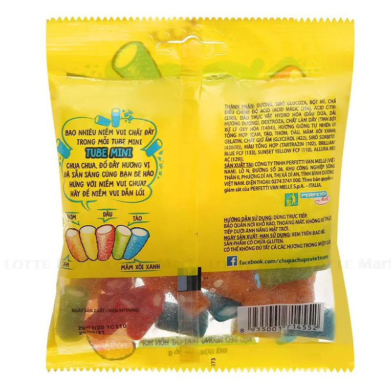 Kẹo Dẻo Chupa Chups Hương Trái Cây Hỗn Hợp Mini Tubes Gói 90g gồm những viên kẹo nhiều màu sắc với hương trái cây chua ngọt đậm vị, kích thích vị giác. Kẹo dẻo hương trái cây hỗn hợp Chupa Chups Sour Mini Tubes dai ngon đến từ kẹo Chupa Chups thương hiệu Tây Ban Nha.