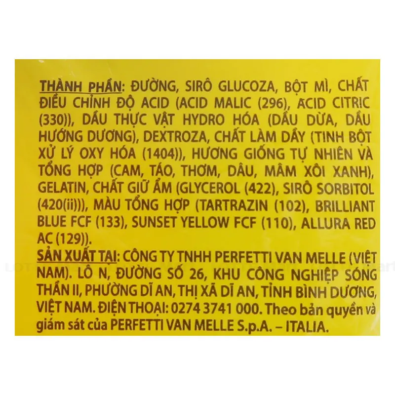 - Đường, siro glucoza, bột mì, chất điều chỉnh độ acid, acid citric, dầu thực vật hydro hoá (dầu dừa, dầu hướng dương), hương trái cây -giống tự nhiên, màu tổng hợp...