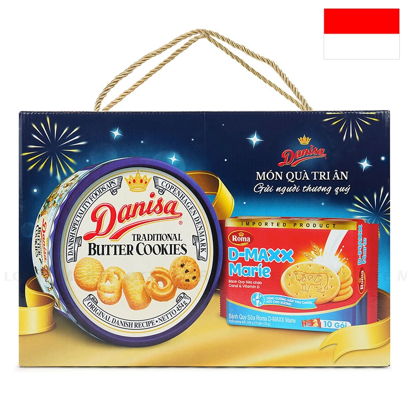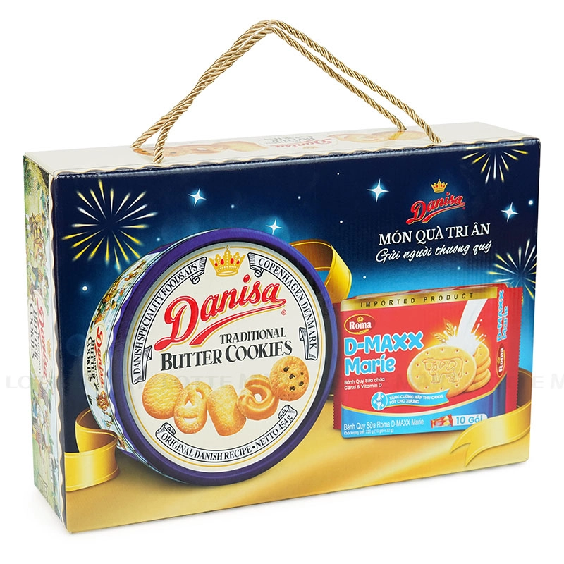 Danisa Biscuit and Roma D-Maxx Marie Biscuit Gift Box is a special gift set that includes traditional Danisa butter biscuits and crispy Roma D-Maxx Marie milk biscuits.