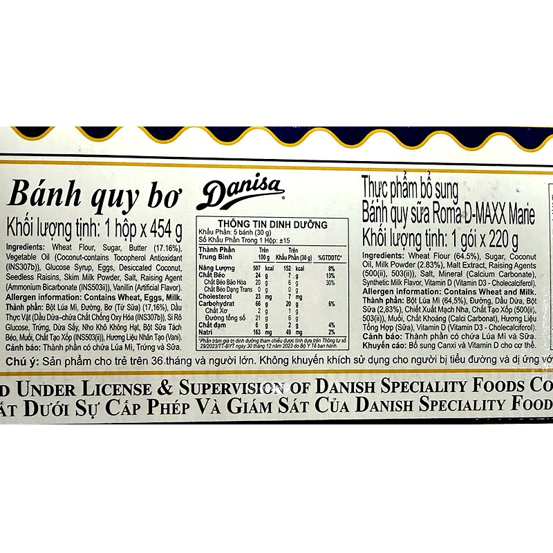 Danisa Butter Biscuits: Wheat flour, sugar, butter (from milk) (17.16%), vegetable oil (coconut oil - contains antioxidant INS 307b), glucose syrup, eggs, dried coconut, seedless raisins, skimmed milk powder, salt, raising agent (INS 503(ii)), artificial flavor (vanilla).