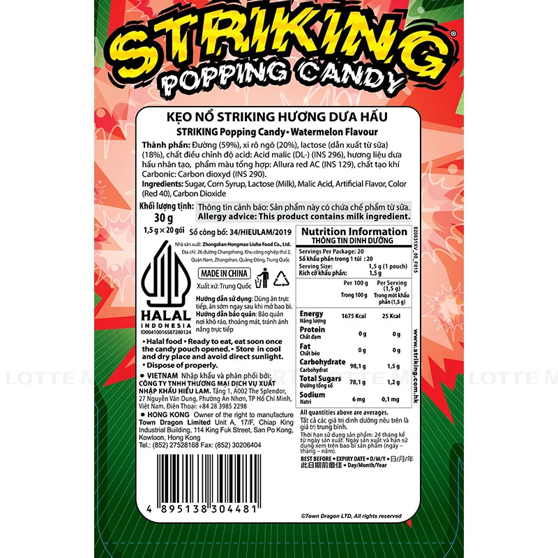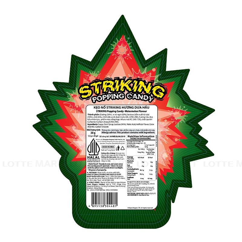 - Kẹo Mút Nổ Striking Hương Dưa Hấu được sản xuất theo tiêu chuẩn an toàn cho sức khỏe người sử dụng. Kẹo sẽ nổ lách tách khi ngậm trong miệng mang đến cảm giác vô cùng thú vị và mới lạ. Kẹo có vị sảng khoái cùng vị chua chua ngọt ngọt thơm ngon, độc đáo.