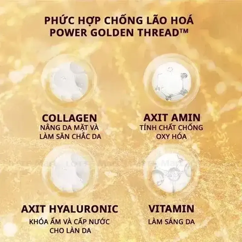 • Phức hợp chỉ vàng (amino acid, collagen, vitamin & Hyaluronic acid): giúp đem lại hiệu quả chăm sóc da đặc biệt hiệu quả nhanh, làm nâng cơ săn chắc da, chống oxy hóa, cấp khóa ẩm và làm sáng da.