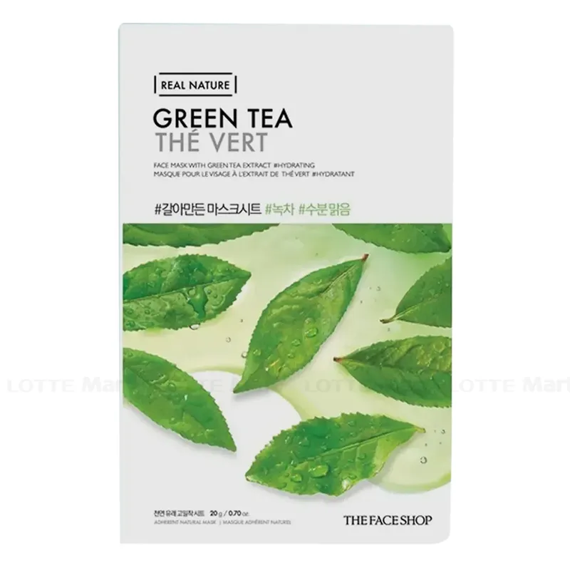 Mặt Nạ Giấy Thanh Lọc Dành Cho Da Nhờn Mụn Real Nature Green Tea 20g với chiết xuất trên 86% thành phần lá trà xanh tự nhiên, nguyên chất giúp tẩy chế bào chết nhẹ nhàng, thải độc da. Bên cạnh đó trà xanh còn giúp ức chế các sắc tố đen, làm mờ vết thâm. Đặc biệt là chống nắng, bảo vệ da trước tác nhân từ môi trường.