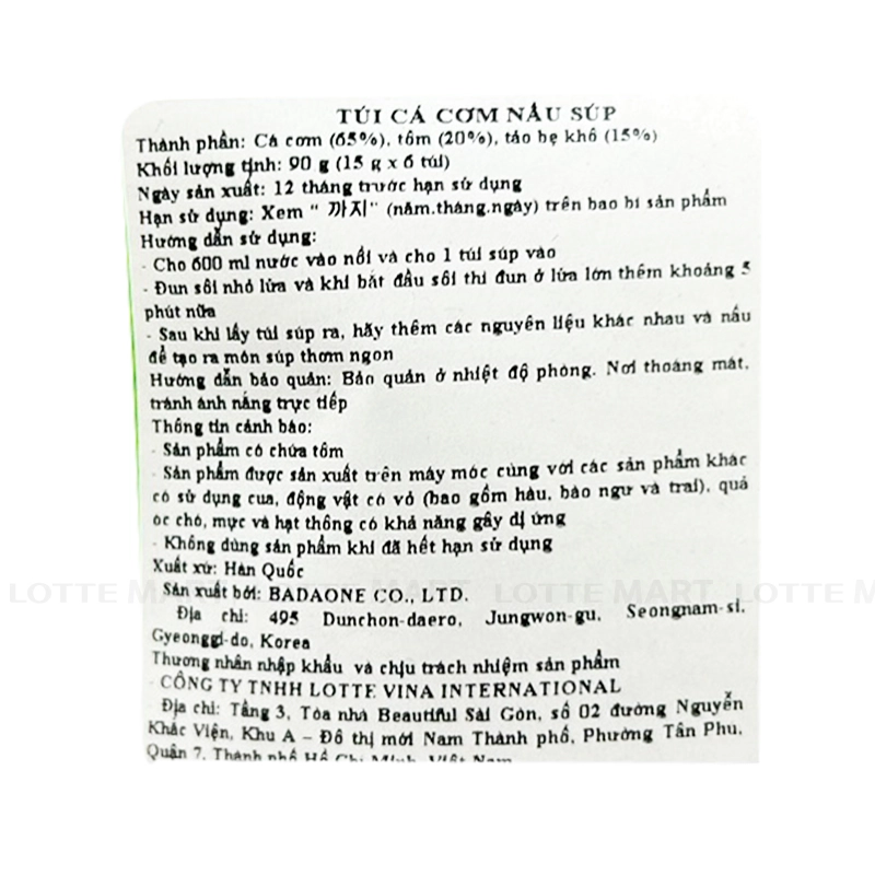 - Gói Nấu Túi Lọc Nước Dùng Badaone Cá Cơm có thành phần chính gồm cá cơm, tôm, cải bẹ tự nhiên, được tuyển chọn kỹ lưỡng để mang lại hương vị nước dùng đậm đà, thơm ngon hấp dẫn.