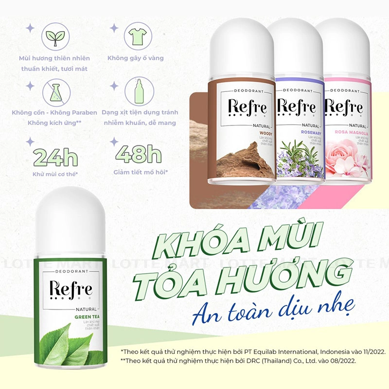 Refre Natural Rose Magnolia Scent Deodorant Roll-On with a formula that effectively locks body odor and reduces sweat, helping you confidently move without worrying about damp underarms.
