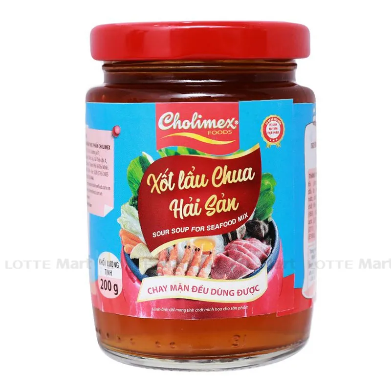 Sốt Lẩu Chua Hải Sản Cholimex Hũ Thủy Tinh 200G giúp món lẩu hải sản của bạn vừa ngọt đậm đà, vừa có vị chua kích thích vị giác. Xốt lẩu với thành phần tươi ngon, an toàn, cho ia đình bạn an tâm khi sử dụng. Thành phần: Ớt, tỏi, hành, gừng, riềng, sả, me, dầu ăn, đường, muối...Hướng dẫn sử dụng: Nấu lẩu: Pha 200g sốt với khoảng 1.5l nước đun sôi. Bổ sung thêm hải sảnh như ốc, mực, đậu hũ, chả cá... và các loại rau tùy thích. Nấu sôi nước 2-3 phút, dùng kèm với bún và nước mắm. Có thể dùng để chế biến món canh tùy thích, dùng trong bữa cơm hàng ngày. Khẩu phần xốt lẩu dùng để nấu lẩu cho 4 người ăn. Hướng dẫn bảo quản: Nhiệt độ thường, nơi khô ráo, thoáng mát. Sau khui hũ bảo quản ở ngăn mátvà sử dụng trong 2 tháng.
