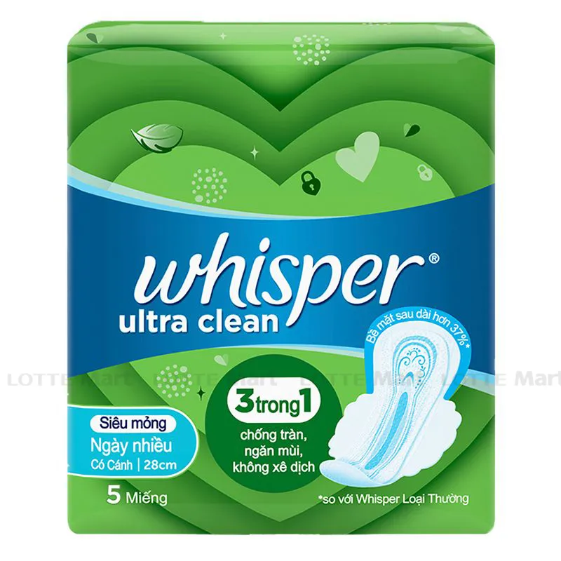 Băng Vệ Sinh Whisper Siêu Mỏng Cánh Siêu Thấm Gói 5 Miếng với thiết kế lưới thấm hút cực nhanh cho bề mặt luôn khô thoáng. Ngoài ra, sản phẩm với rãnh bảo vệ khép kín, chống thấm tràn sang hai bên và hai đầu giúp bạn gái luôn tự tin và thoải mái trong những ngày ấy. Thiết kế gọn nhẹ, tiện lợi khi sử dụng và mang theo mọi nơi.