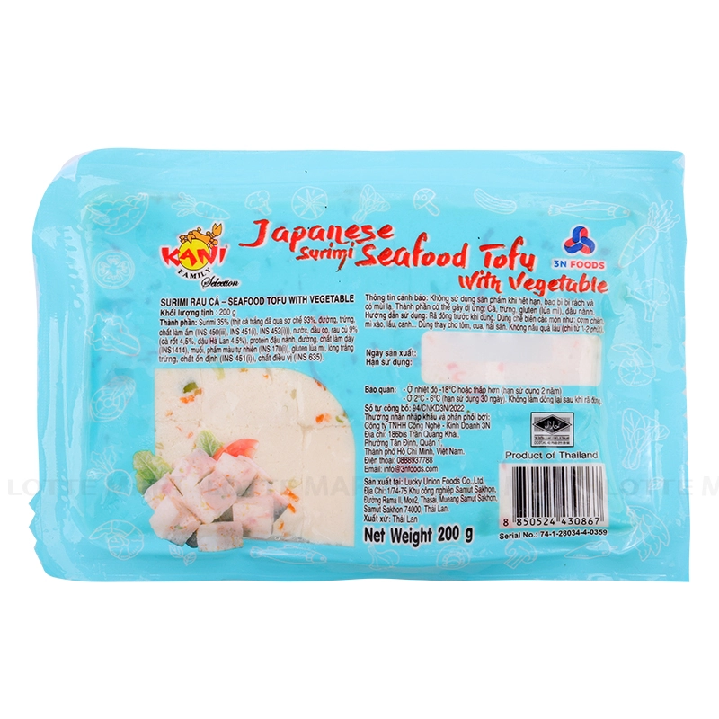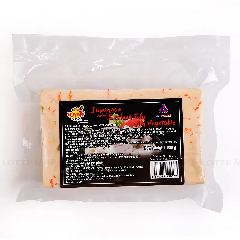 Thành phần: Surimi(chế biến từ chất đạm cá đục, E450, E451, E452), tinh bột(E1414), muối, đường, lòng trắng trứng, rau(đậu, cà rốt).