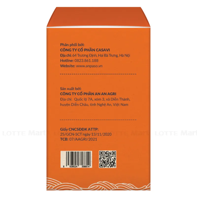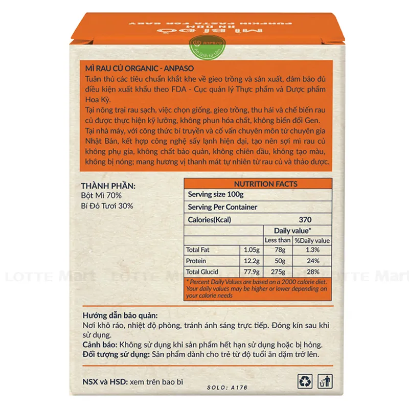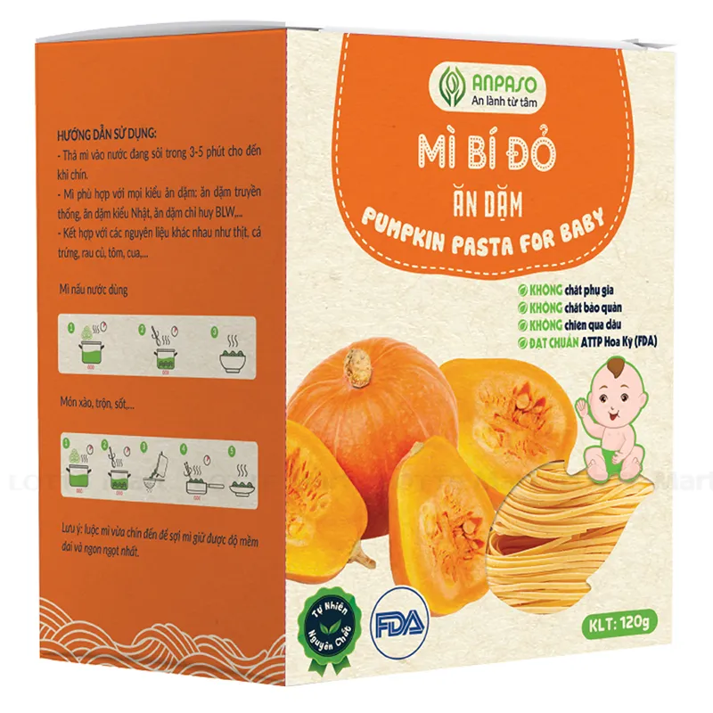 - Sản phẩm Mì rau củ ăn dặm Organic Anpaso đạt chuẩn hữu cơ USDA và được cấp chứng nhận FDA bởi cục quản lý thực phẩm và dược phẩm Hòa Kỳ.