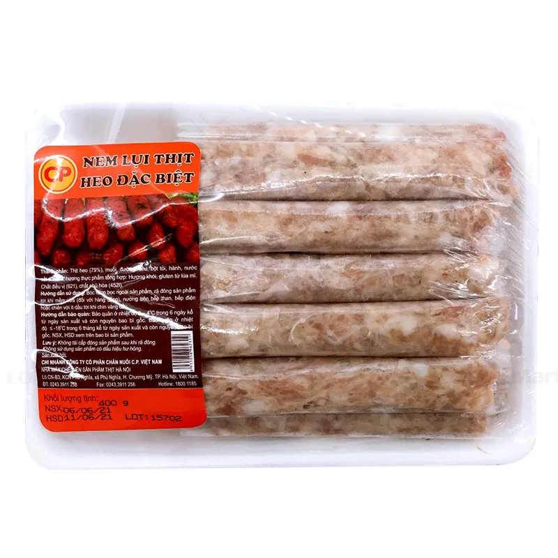 - Nem Lụi Thịt Heo Đặc Biệt CP 400g được biến từ nguyên liệu chính là thịt heo đã được chọn lọc kỹ càng, kết hợp với công thức tẩm ướp đặc biệt từ nhãn hiệu CP cho ra đời món ăn hấp dẫn, chất lượng.