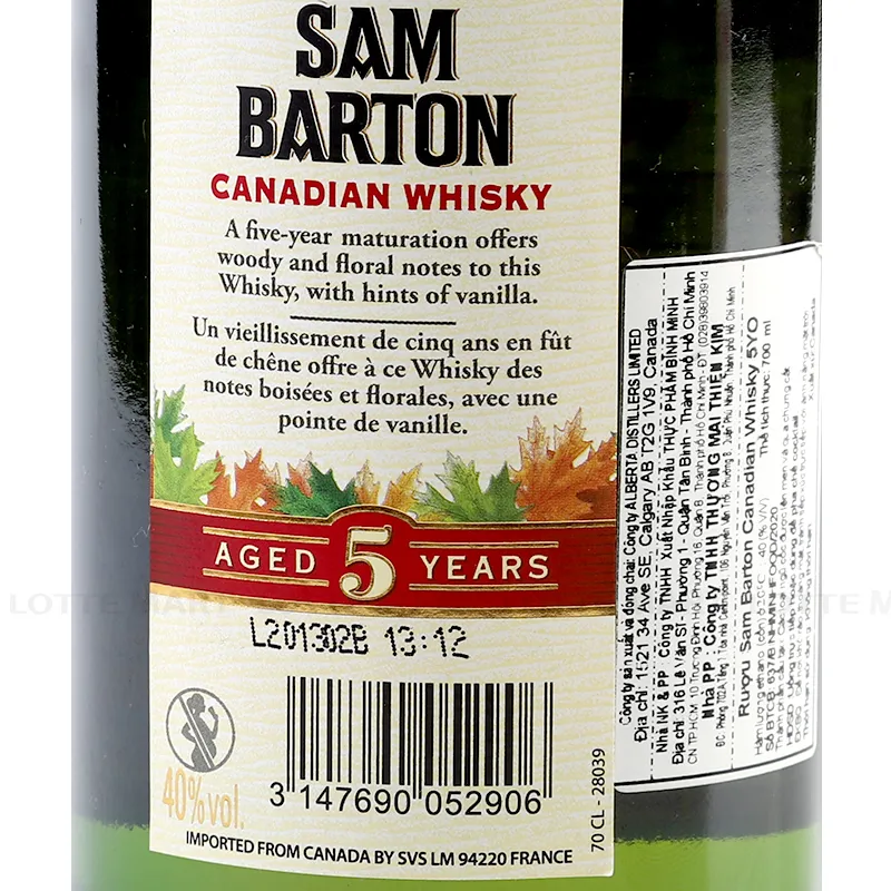 • Rượu Canada Whisky Sam Barton 5 Năm 40% ABV Chai 700ml - một sản phẩm rượu đến từ thương hiệu Sam Barton của đất nước Canada xinh đẹp, chai rượu này là sự kế thừa tất cả những giá trị mà nhà sản xuất đã gửi gắm trong đó.