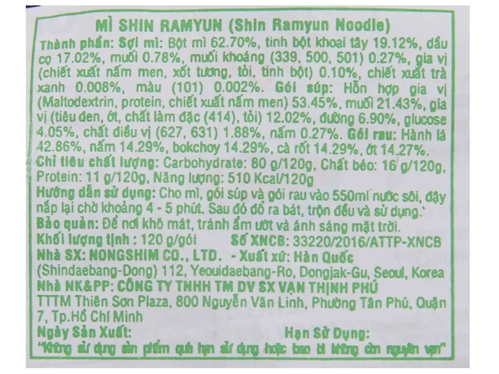 - NOODLES - Wheat flour, potato starch, palm oil, mineral salts, seasonings (yeast extract, soy sauce, garlic, starch), green tea extract, color.