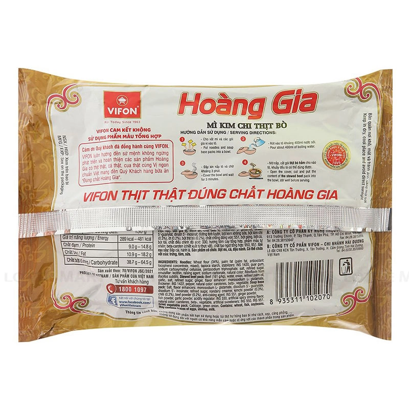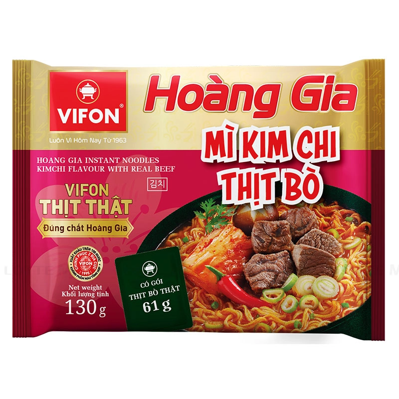 VIFON Hoang Gia 김치 소고기맛 즉석면은 신선한 순수 소고기 팩이 특징이며, 현대적인 멸균 기술로 처리하여 맛과 영양분을 온전히 보존합니다.