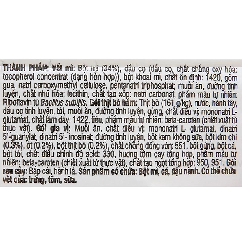 면: 밀가루 (34%), 팜유 (팜유, 항산화제 (혼합형 토코페롤 농축액)), 타피오카 전분, 안정제 (INS 1420, 구아검, 카르복시메틸셀룰로오스나트륨, 삼인산오나트륨), 소금, 정제 설탕, 유화제 (레시틴), 팽창제 (탄산나트륨), 천연색소 (바실러스 서브틸리스 유래 리보플라빈). 소고기 스튜 팩: 소고기 (161g/kg), 물, 양파, 정제 팜유, 마늘, 소금, 정제 설탕, 생강, 향미증진제 (L-글루탐산모노나트륨), 증점제 (INS 1422), 후추, 천연색소 (베타카로틴 (식물 추출물)).