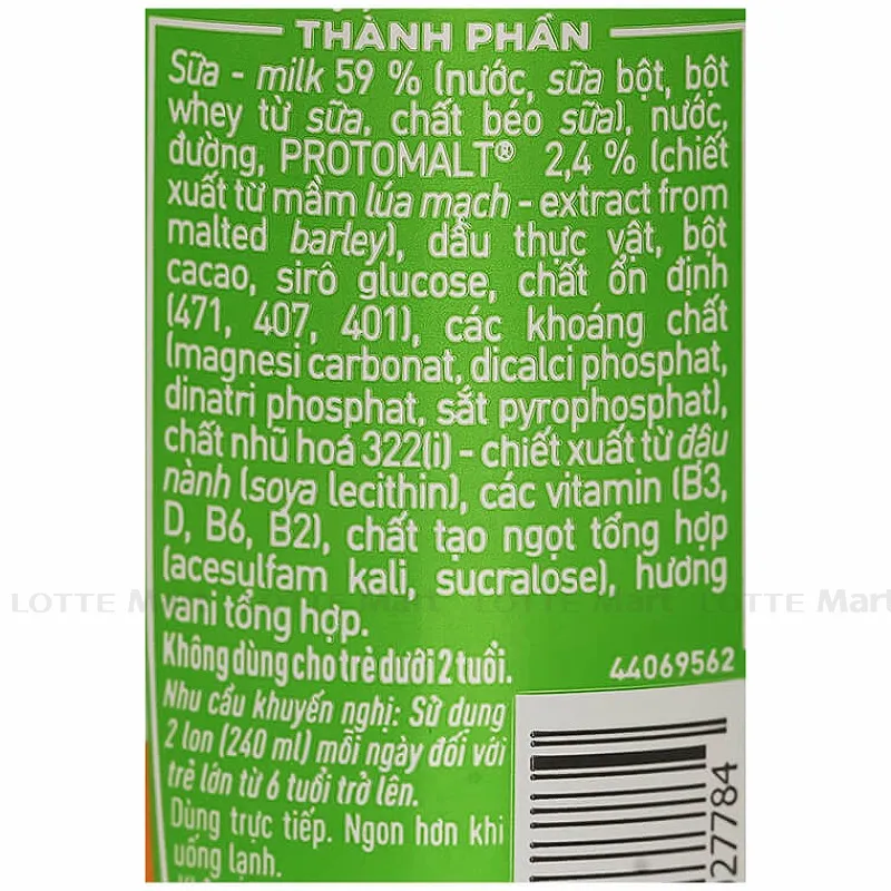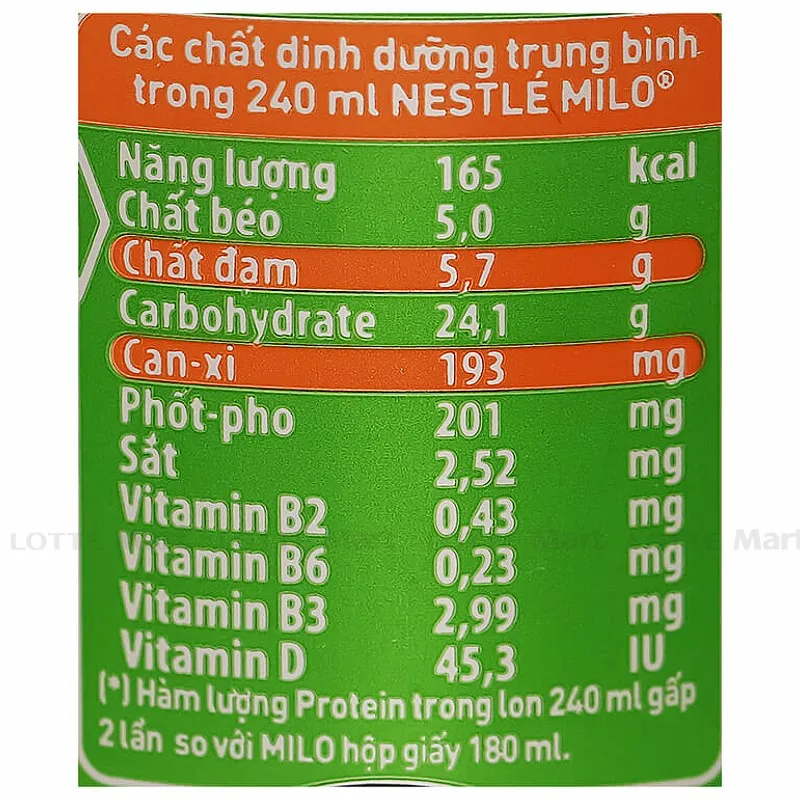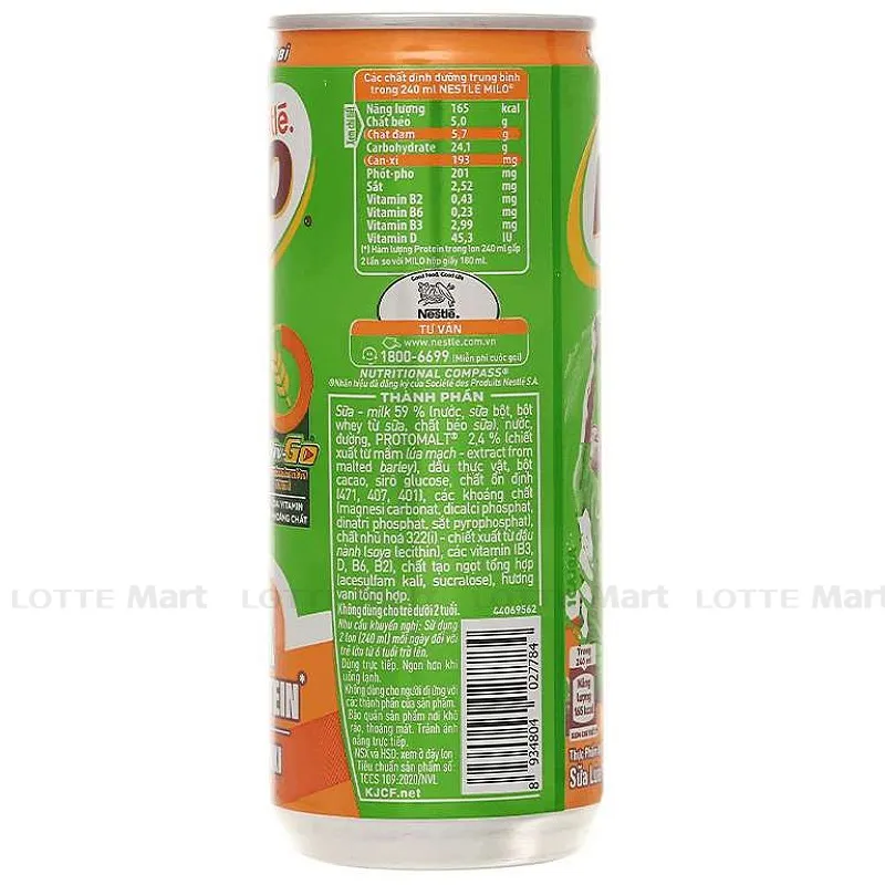 Sữa Milo Nestle Lon 240ML với công thức protomalt là chiết xuất dinh dưỡng vượt trội từ mầm lúa mạch nguyên cám, sữa, bột ca cao... được bổ sung nhiều Vitamin và khoáng chất, cung cấp dưỡng chất cần thiết cho trẻ.