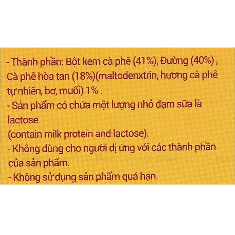 - Đường (40%), bột kem cà phê (41%), cà phê hòa tan (18%), (maltodenxtrin, hương cà phê, bơ, muối) 1%, một lượng nhỏ đạm sữa là lactose.