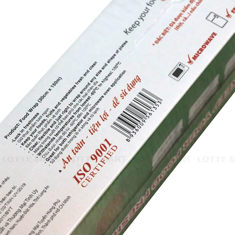 - Điểm đặc trưng là kích thước khổ rộng 30 cm, phù hợp với đại đa số các trường hợp thực phẩm trong bếp gia đình cần được bảo quản bằng màng bọc.