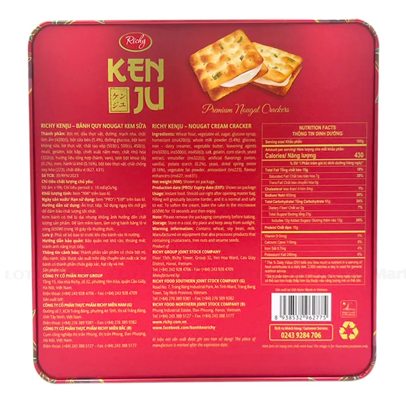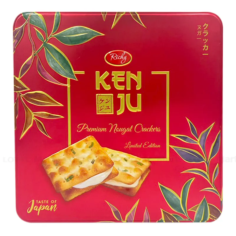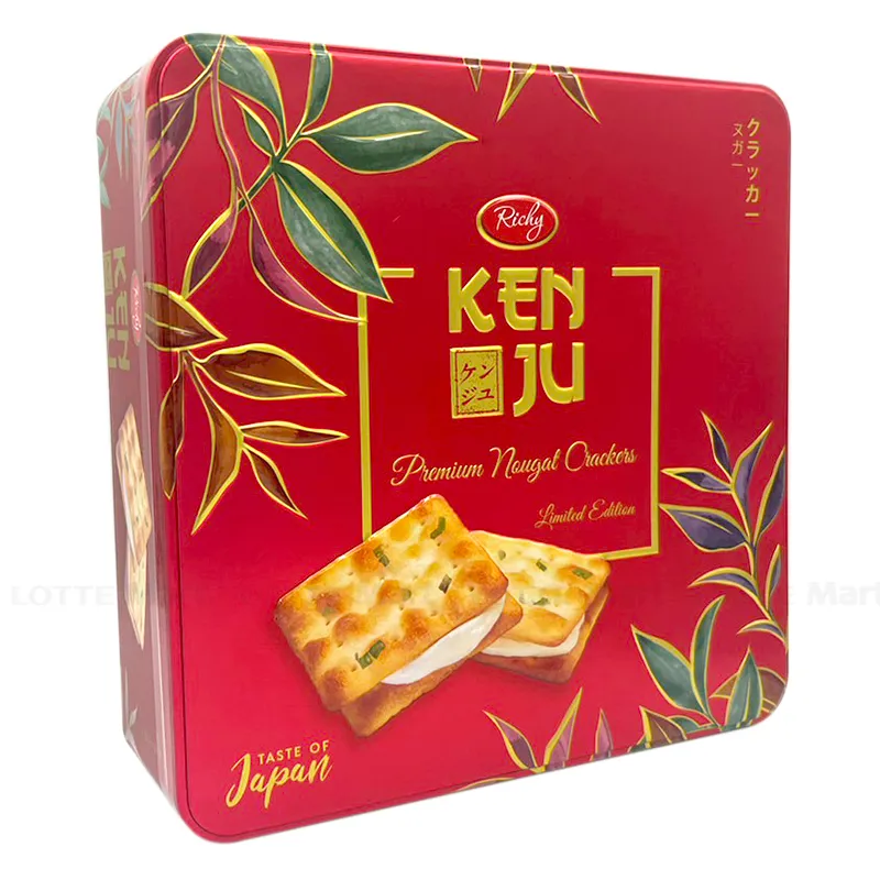 - Bánh Kenju Nhật Hộp Thiếc 372G chịnh phục người dùng bởi vị bánh giòn rụm - nhân nougat dẻo dai, hương mặn ngọt kết hợp hài hòa mà độc đáo, những hộp bánh Kenju là món quà tinh tế gửi trao người thân, bạn bè . Điểm nổi bật Bánh quy giòn Richy KenJu Nhật dẻo dai, ứng dụng công nghệ Nhật Bản vào sản xuất, đảm bảo tiêu chuẩn VSATTP.