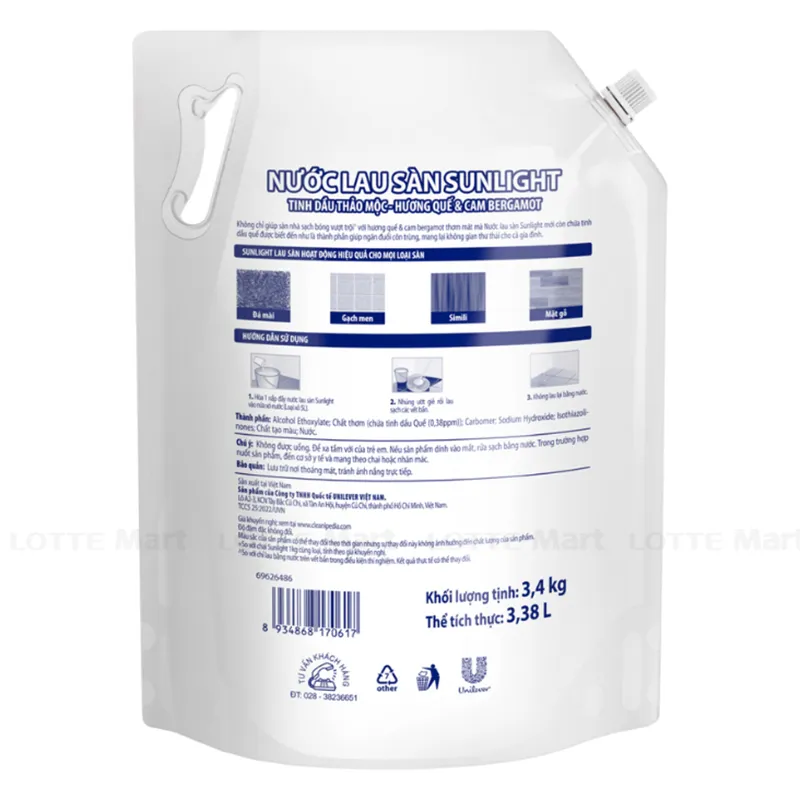 Nước Lau Sàn Sunlight Hương Quế Túi 3.4KG không chỉ giúp lau nhà sạch hiệu quả, không còn vết bẩn mà còn ngăn côn trùng nhờ tinh dầu quế/ sả. Nước lau sàn Sunlight chứa tinh dầu thảo mộc, đem lại hương thơm thư thái, dễ chịu, phù hợp với mọi loại sàn. Đặc điểm nổi bật và công dụng: Nước lau nhà Sunlight làm sạch an toàn nhờ thành phần làm sạch 100% từ thiên nhiên và độ pH trung tính giúp nhà sạch bóng, tránh xa côn trùng, an toàn cho da. Giúp vệ sinh nhà cửa dễ dàng, không còn tì vết với công nghệ sạch bóng vượt trội. Đem tới không gian thư thái cho cả gia đình cùng thư giãn sau khi lau sàn. Nước lau sàn hiệu quả trên mọi loại sàn, phù hợp để sử dụng làm nước lau sàn gỗ. Thành phần: Alcohol, Chất thơm (chứa tinh dầu quế, carbomer, sodium...), Nước, Carbomer, chất tạo màu, chiết xuất chanh... Hướng dẫn sử dụng: Hoà 1 nắp đầy nước lau sàn vào nửa xô nước loại 5 lít. Nhúng ướt giẻ lau, rồi lau tất cả các vết ố bẩn. Sàn nhà sạch bong sáng bóng. Chú ý: Không được uống. Để xa tầm tay trẻ em. Nếu sản phẩm dính vào mắt, rửa sạch bằng nước sạch. Nếu nuốt hoặc uống phải dung dịch sản phẩm, nên đến cơ sở y tế, đem theo chai hoặc nhãn sản phẩm.