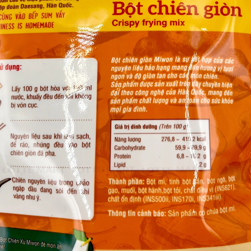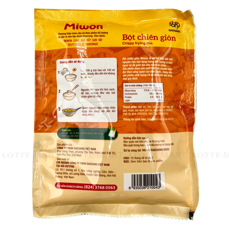 Bột Chiên Giòn Miwon 100G là một sản phẩm được sản xuất theo công nghệ hiện đại với các thành phần tự nhiên và gia vị đã được nêm vừa đủ, giúp cho các món chiên như tôm lăn bột, thịt lăn bột,… trở nên thơm ngon, hấp dẫn. Bột có thành phần tự nhiên, được chọn lọc kĩ càng bởi các chuyên gia trong ngành thực phẩm, quy trình chế biến khép kín đảm bảo an toàn vệ sinh thực phẩm và không gây hại với sức khỏe người tiêu dùng. Bột được sản xuất với công thức đặc biệt đã qua nghiên cứu lâu năm, đem tới hương vị thơm ngon hấp dẫn cho các món rán. Sản phẩm giúp tạo lớp áo bột giòn tan cho các món thịt, hải sản cũng như giúp món ăn tăng thêm vị đậm đà và hương thơm hấp dẫn.
