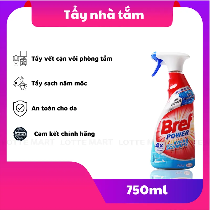 Chai Xịt Tẩy Rửa Đa Năng Bref Power Kalk & Schmutz Chai 750ml giúp loại bỏ ngay các vết bẩn cứng đầu như các vết bám bẩn, vết đốm nước, cặn kem đánh răng, cặn canxi, gỉ sắt, cặn xà phòng bám két lâu ngày trên gương, vách kính nhà tắm, vòi chậu inox, bồn rửa, sen vòi, bồn tắm, tường gạch… và các thiết bị vệ sinh khác mà những chất tẩy rửa thông thường không thể làm sạch.