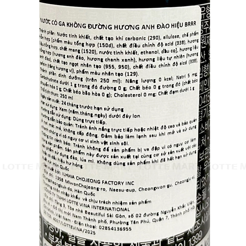 Nước Uống Có Gas BRRR Vị Anh Đào Không Đường là sản phẩm nước có gas được sản xuất tại Hàn Quốc, nổi bật với công thức không đường, không calo và không chất bảo quản, lý tưởng cho người ăn kiêng.