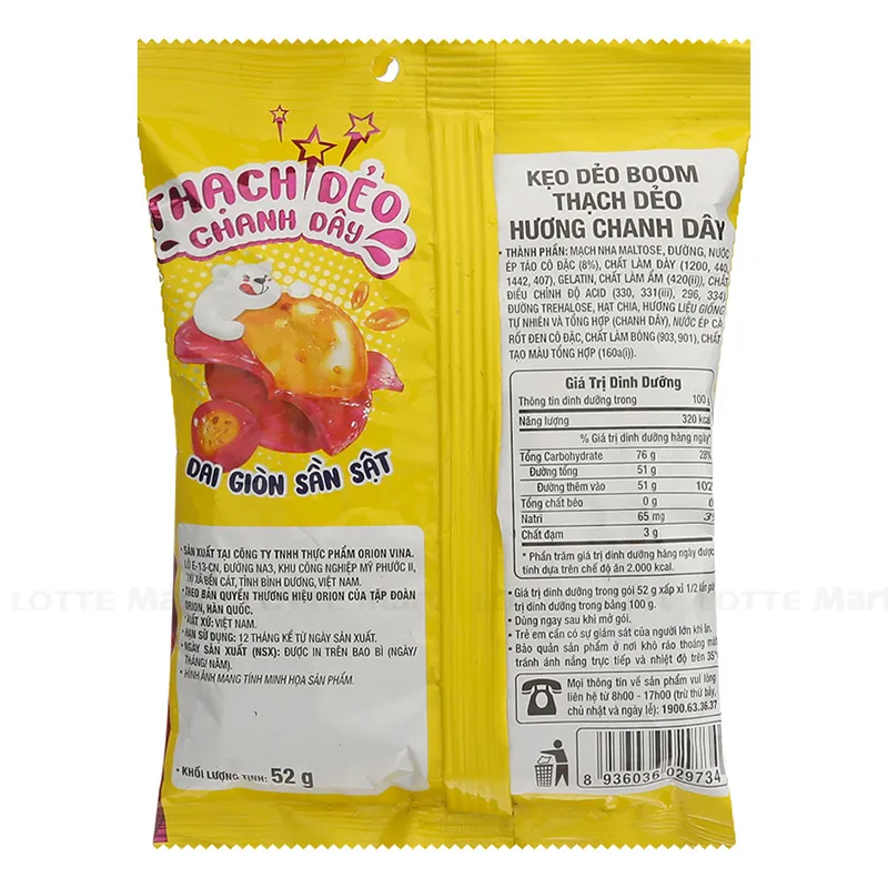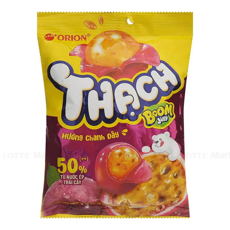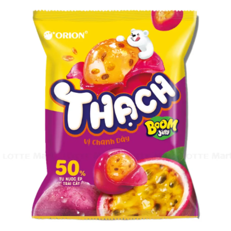 - Kẹo Dẻo Thạch Hương Chanh Dây Orion Boom Jelly Gói 52g là sản phẩm tiên phong trong dòng kẹo dẻo có nhân. Kẹo được tăng cường 50% nước trái cây thật, kết hợp chanh dây cùng hạt chia vô cùng hấp dẫn. Bên cạnh đó, cấu trúc 2 lớp kẹo lột độc đáo cũng sẽ mang lại trải nghiệm đầy mới mẻ cho các bé.