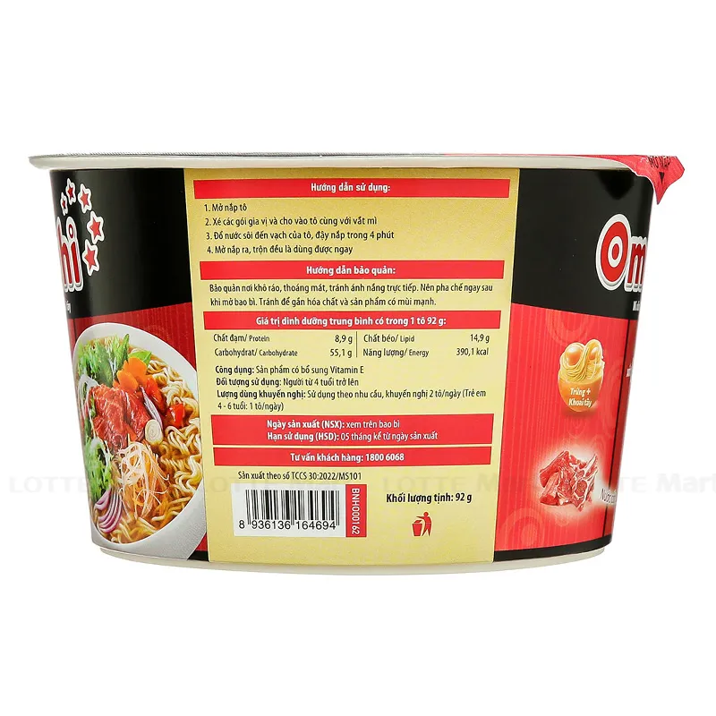 Thành phần: VẮT MÌ - Bột mì, dầu thực vật, tinh bột khoai mì, muối, tinh bột khoai tây (20g/kg), muối, nước mắm, chất tạo xốp (451i, 452i, 500i, 500ii), chất làm dầy (412), chất điều vị (621, 635), chiết xuất nấm men,...SÚP - Nước, dầu thực vật, muối, đường, chất điều vị (621, 635, 364ii), hỗn hợp gia vị và thảo mộc, mỡ bò (14,3 g/kg), ngò gai, cà rốt sấy (11,9 g/kg), hành tây, cà chua cô đặc, ớt (8,2 g/kg), tỏi, hương tổng hợp (hương bò hầm, hương bò, hương ngò gai), hỗn hợp gluten lúa mì...