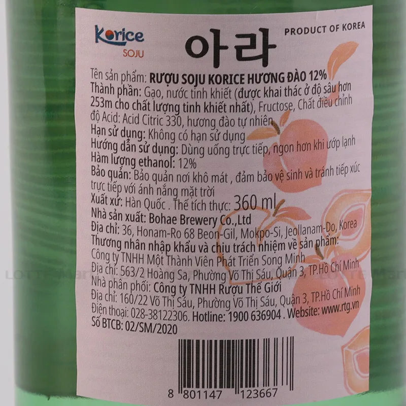Rượu Soju Korice Vị Đào 12% Vol Chai 360ml