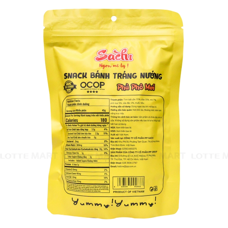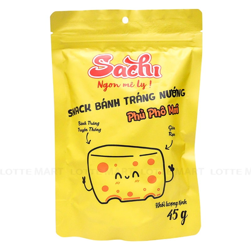 - Snack Bánh Tráng Nướng Phô Mai Sachi là món ăn vặt thơm ngon, kết hợp sự giòn rụm của bánh tráng nướng với hương vị béo ngậy đặc trưng của dừa và phô mai, tạo nên một món ăn vặt không thể cưỡng lại. Được chế biến từ những nguyên liệu chất lượng như gạo, bột mì, nước cốt dừa và bột phô mai cao cấp, bánh tráng nướng Sachi mang đến sự hòa quyện hoàn hảo giữa vị béo ngậy của dừa và vị thơm lừng, béo ngọt của phô mai.