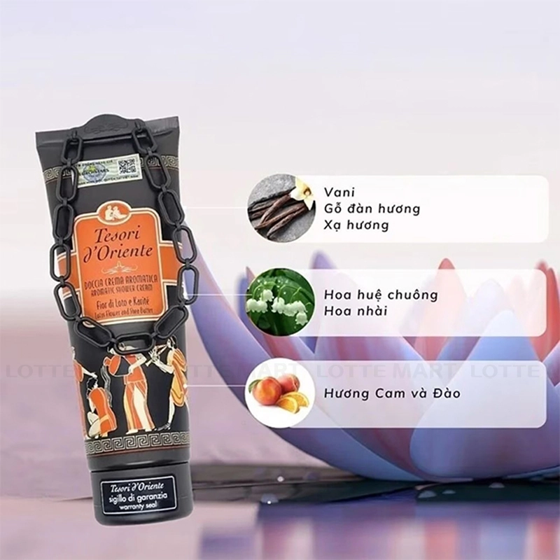 - Sữa Tắm Nước Hoa Tesori d'Oriente Hương Hoa Sen là sữa tắm hương nước hoa lấy cảm hứng từ nghi thức của các vị thần Phương Đông, mang lại một cảm giác dễ chịu, sảng khoái cho tất cả các giác quan sau khi tắm với hương thơm ngọt ngào, ấm áp.