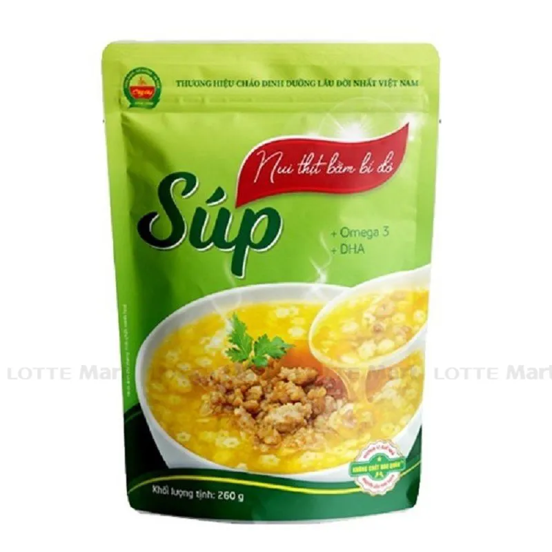 Thành phần: Nước hầm xương, nui (12%), thịt heo (10%), bí đỏ (8%), bột năng (2%), thực phẩm bổ sung dầu ăn dinh dưỡng cho trẻ nhãn hiệu kiddy, muối tinh, đường tinh luyện, chất điều vị, chất làm dày.