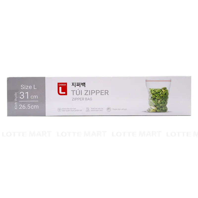 Túi Zipper Choice L 20 Túi Size L 26.5cmx31cm có khả năng chịu được nhiệt độ cao, giúp bảo quản thực phẩm tốt, an toàn cho người sử dụng. Thiết kế với đường zip trên miệng túi rất thuận tiện để cất giữ thực phẩm bên trong mà không cần phải qua một công đoạn trung gian như buộc, thắt miệng túi lại.