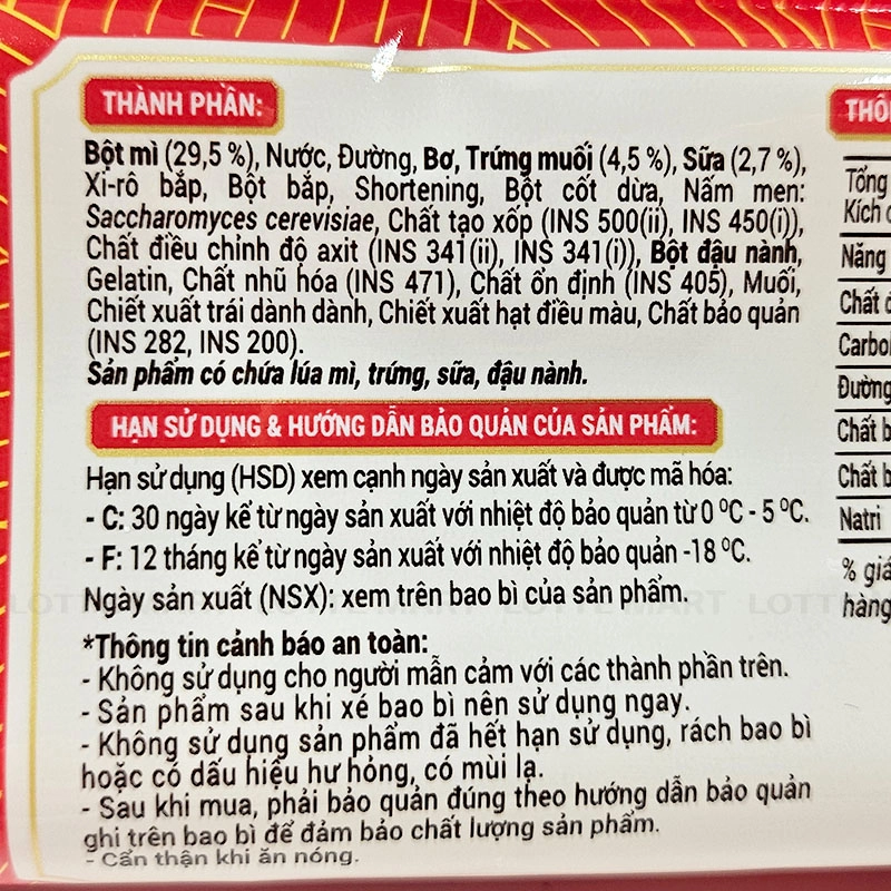 Thành phần: Bột mì, bơ, trứng muối, sữa tươi, nước cốt dừa, màu tự nhiên ( chiết xuất quả dành dành), phụ gia thực phẩm.