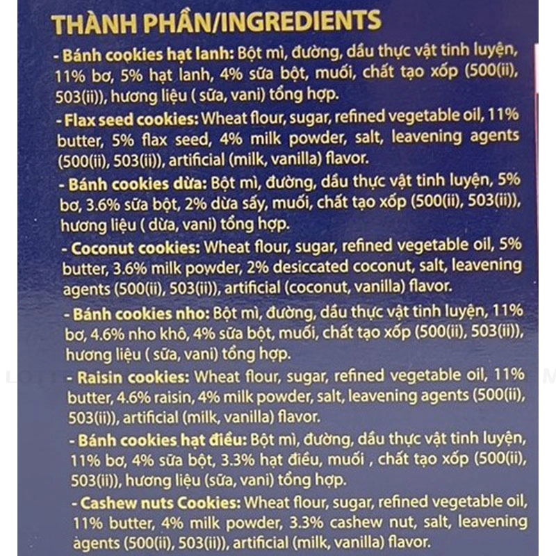 Bánh quy mang đến hương vị thơm ngon, độ ngọt, béo vừa phải không quá ngấy hoà quyện cùng vị thơm của bơ và sữa, có vị giòn tan của những hạt sôcôla, hạt điều và vị mới lạ của bánh quy trà xanh. Những chiếc bánh quy được làm từ những nguyên liệu chọn lọc như: bột mì, đường, chất béo, mạch cung cấp nhiều chất dinh dưỡng thiết yếu cho cơ thể giúp bạn tràn đầy năng lượng cho ngày làm việc hiệu quả. Bên cạnh đó, sản phẩm được sản xuất theo dây chuyền công nghệ hiện đại và quy trình kiểm tra nghiêm ngặt không chứa hóa chất, chất bảo quản độc hại, đảm bảo sức khỏe cho người tiêu dùng.