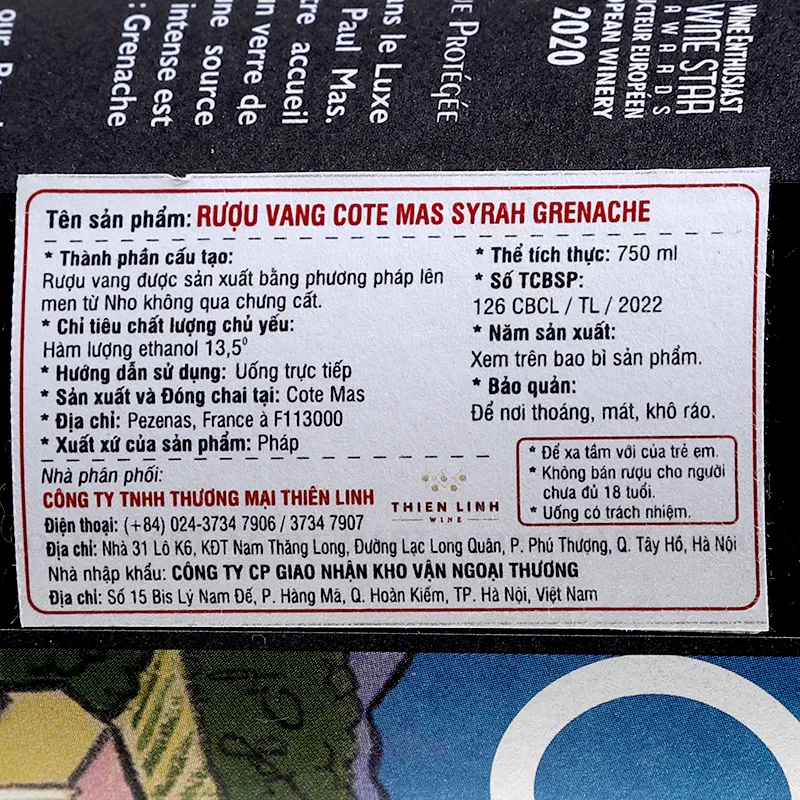 Rượu Vang Đỏ Cote Mas Syrah Grenache 13.5% ABV Chai 750ml