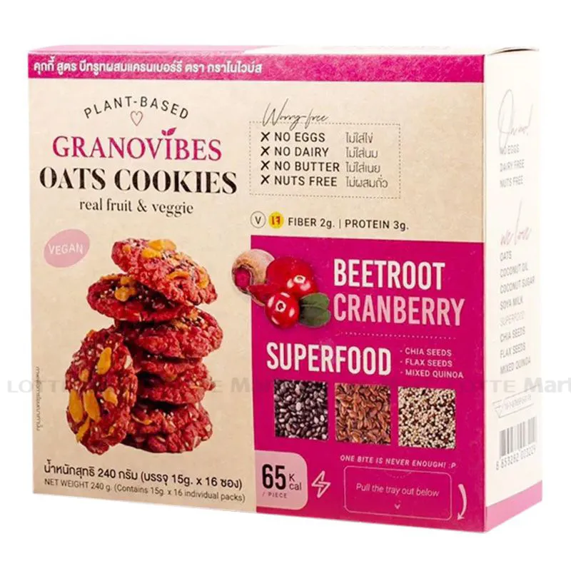 Bánh Ngũ Cốc Yến Mạch Nam Việt Quất Hộp 240G là sự kết hợp của nhiều nguyên liệu có nguồn gốc từ thực vật, vị của hạt ngũ cốc yến mạch kết hợp với nam việt quất chua nhẹ, béo bùi giúp bạn trải qua nhiều tầng lớp hương vị khác nhau. Mùi thơm, ngon, béo bùi trên từng miếng bán quy hợp khẩu vị với nhiều người. Có thể thưởng thức cùng sữa/cafe cho buổi sáng hoặc bữa tiệc trà chiều. Hương vị thơm ngon, tốt cho sức khỏe, cung cấp chất xơ, năng lượng cho cơ thể. Thành phần: Bột yến mạch (59 %), bột lúa mì (10 %), sữa đậu nành (10 %), nam việt quất khô (7 %), yến mạch (5 %), củ dền (2 %), bắp rang (2 %), hạt chia (1 %), hạt lanh (1 %), hỗn hợp diêm mạch (1 %), dầu dừa (1 %), đường dừa (0,95 %), muối (0,05 %). Thông tin dị ứng: Sản phẩm có nguồn gốc thực vật được làm bằng trái cây và rau thật, thuần chay. Sản phảm không chứa trứng, sữa, bơ, không lo dị ứng. Quy cách sản phẩm: Bánh quy yến mạch Granovibes gồm 1 hộp 16 gói. Xuất xứ: Thái Lan. Hạn sử dụng: 12 tháng kể từ ngày sản xuất. Bảo quản: Bảo quản nơi khô mát, tránh ánh nắng trực tiếp.