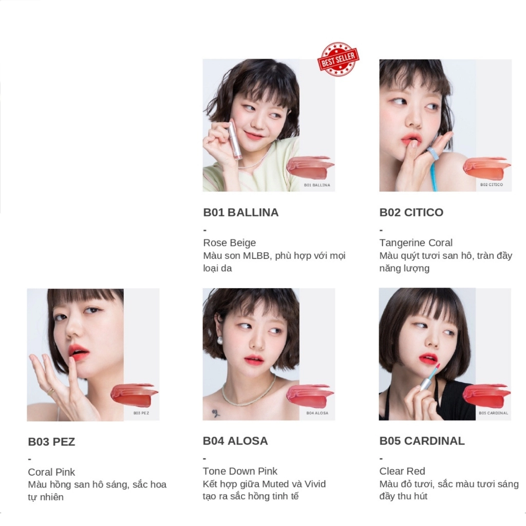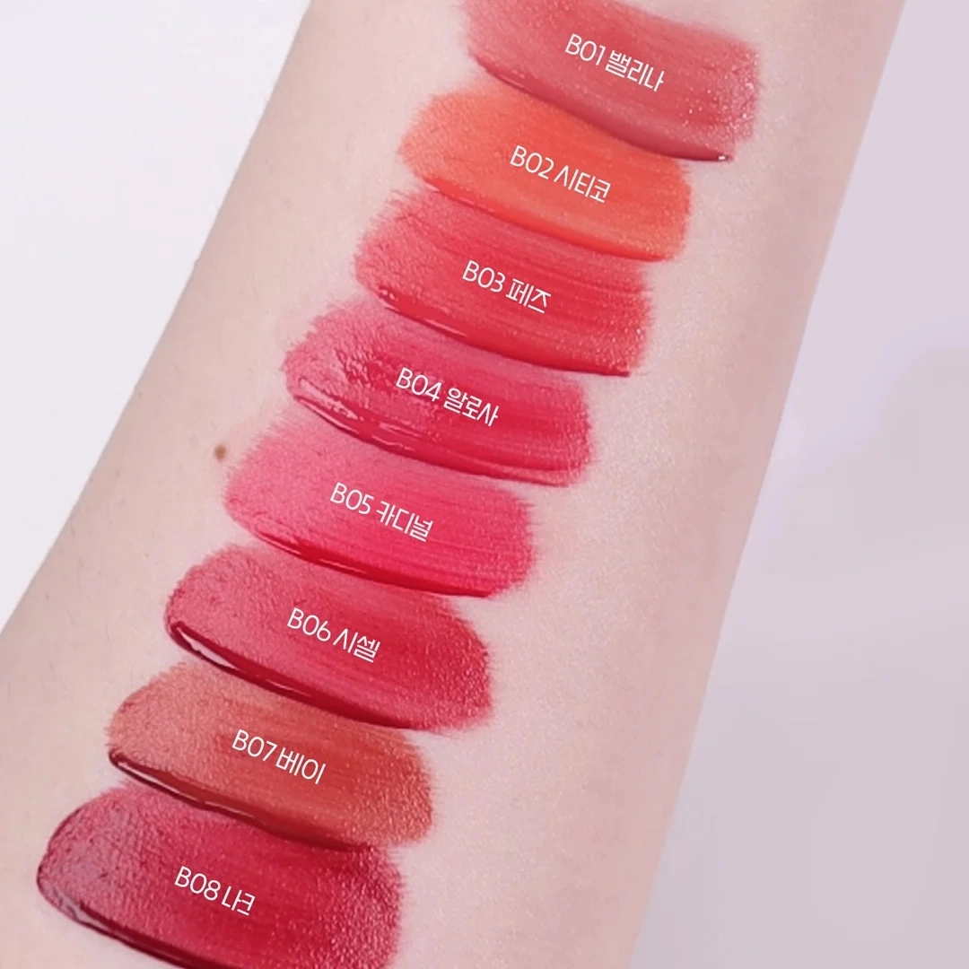 - Công thức thuần chay, chỉ sử dụng thành phần tự nhiên. Không thử nghiệm trên động vật (có giấy chứng nhận của bộ y tế Hàn Quốc). Khả năng thay đổi kết cấu trên môi từ tint bóng thành tint lì.